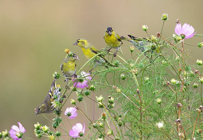 | コスモスの実に120〜30羽位の大きな群れがついていました。 |