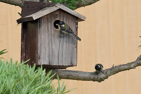 | シジュウガラの巣箱は地上1b50pくらいで、高すぎるとスズメ君と 競合する事から、多勢に無勢でスズメに負けます。 |